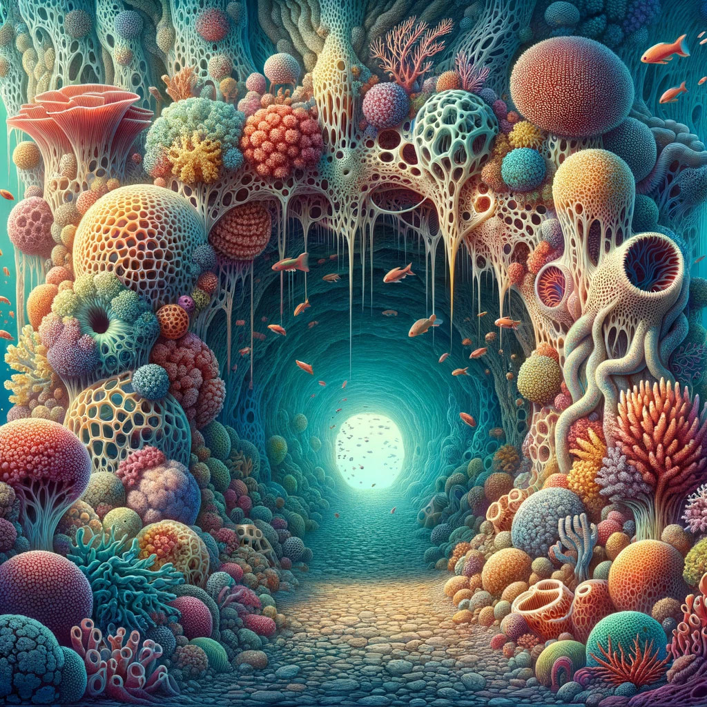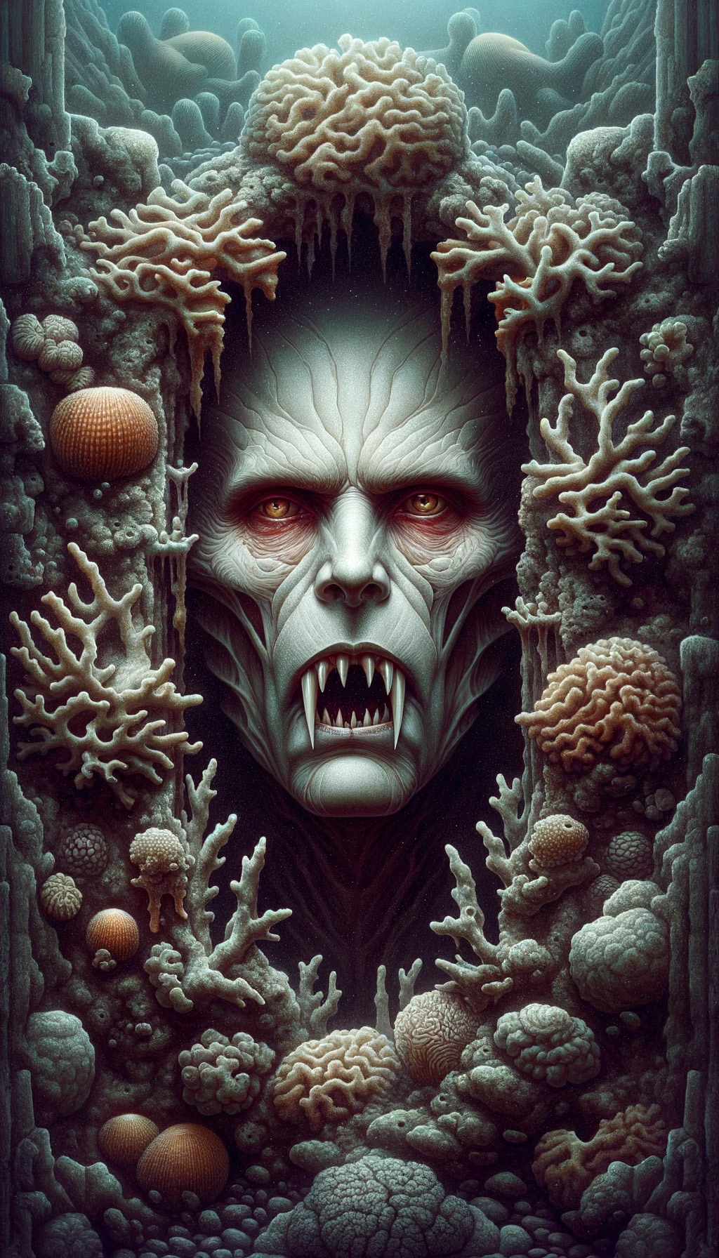 Prompt: "A deep-sea vampire entombed in an ancient wall of coral."